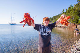 The high point on every windjammer cruise, the lobster picnic takes place on a secluded shoreline beach, once again off the beaten path. Resting on a beach enjoying every morsel with a majestic Maine windjammer as the backdrop is the pinnacle of the experience. Ok, the fresh lobsters are pretty darn good as well! Time is the key to a perfectly cooked lobster over a fire, which allows guests the opportunity to head off for a swim, beach combing, hiking or perhaps row and explore the harbor. Not a lobster lover? No need to worry, we would never let our guests go hungry! There are plenty of other options to eat at the picnic other than our honored crustacean dinner guests.